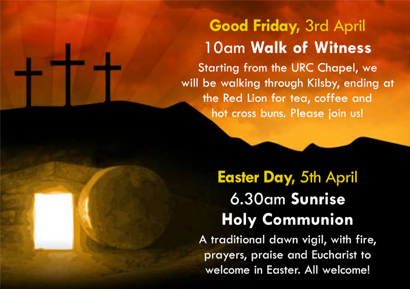 Good Friday, 3rd April 10am Walk of Witness - meeting outside the URC chapel, we will be walking through the village, ending up at the Red Lion for tea, coffee and hot cross buns